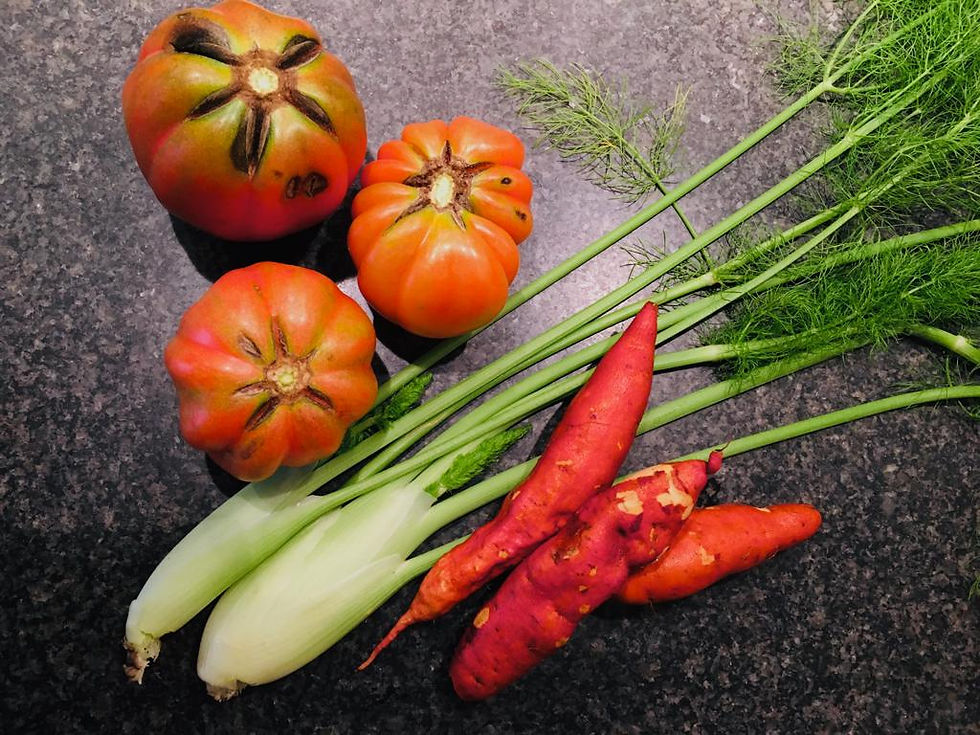 Soms loop je door d’r Moostuin en vind je groenten of kruiden waarvan je dacht dat ze al op, uitgebloeid of uitgegroeid waren zoals een paar vergeten venkelknolletjes, een handvol zoete aardappels, tóch nog een paar prachtig rode coeur de boeuf, krakend verse regenboog snijbiet, nieuwe scheuten aan de citroenverbena of nog steeds bloeiende kaapse knoflook.